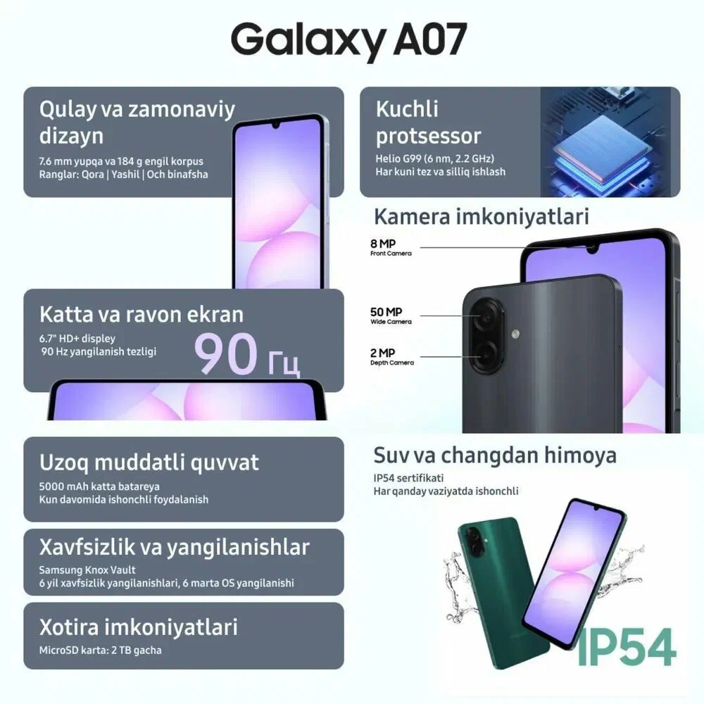 Samsung Galaxy A07 smartfoni (2025-yilda chiqarilgan) A seriyasidagi kirish darajasidagi telefon sifatida joylashtirilgan. Modelning ba'zi texnik xususiyatlari: ekran, protsessor, xotira va kamera.